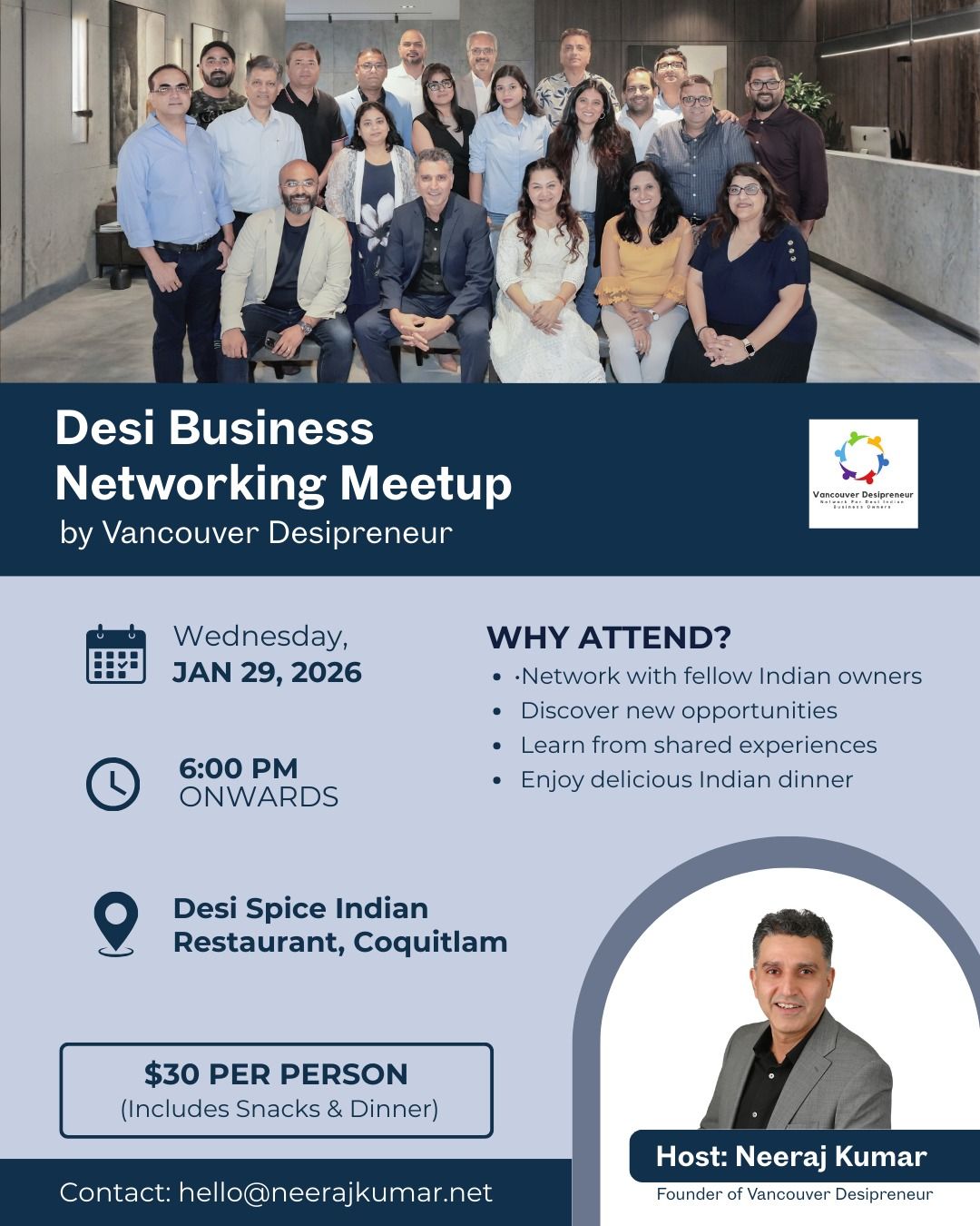 It is a purpose-driven platform built on community-led business growth, meaningful collaboration, and long-term relationships. The upcoming Desipreneur event brings together Indian origin business owners in Vancouver, professionals, and aspiring entrepreneurs in an environment that feels welcoming, purposeful, and genuinely supportive.